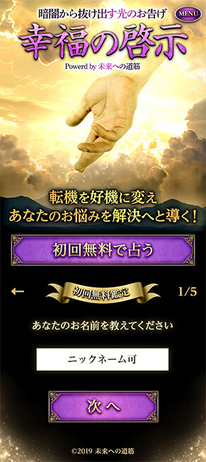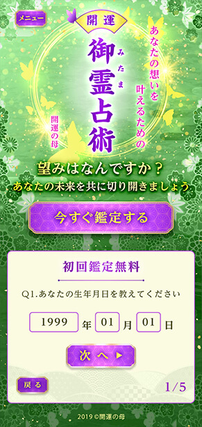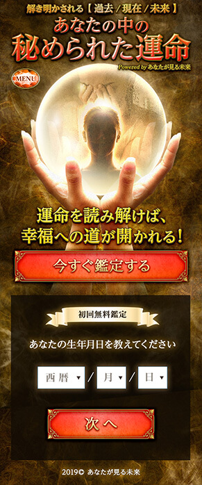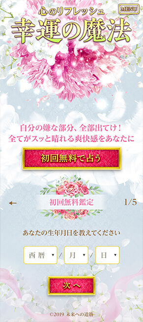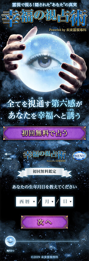 リスティング広告用LP一覧未分類2023.08.062016.04.01株式会社ZAIZENにて占いLPを作成。 LP内にフォームを設置しjavascriptで画面切り替えを行い、会員登録を促すLPを複数作成いたしました。■制作担当 デザイン コーディング